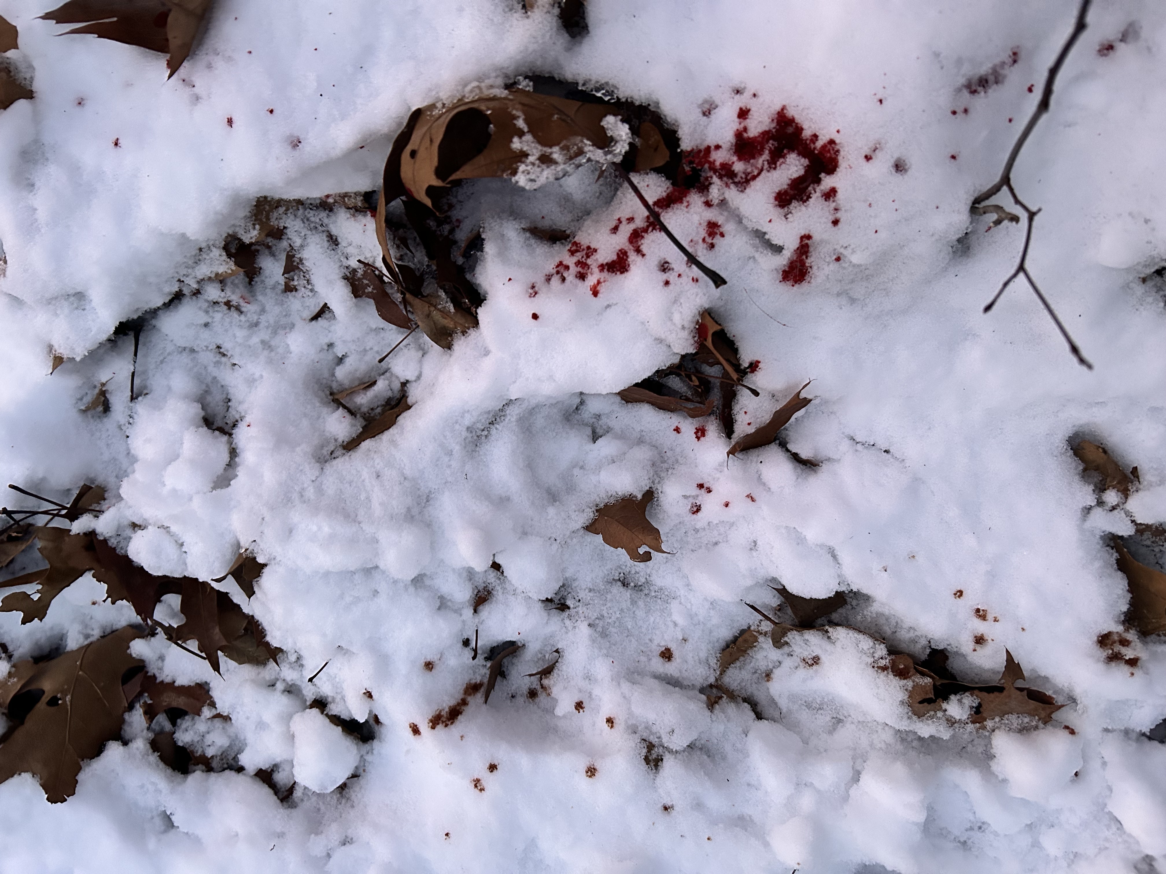 After about 40 minutes since the shot, I started trailing the blood in the snow and found him about 60 yards away, laying under a pine tree.